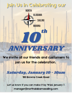 DETAILS: Join us in celebrating our 10th Anniversary! We invite all our friends and customers to join us for the celebration. Please let us know if you can make it by Wednesday, January 7 by emailing manager@northalabamasailing.com