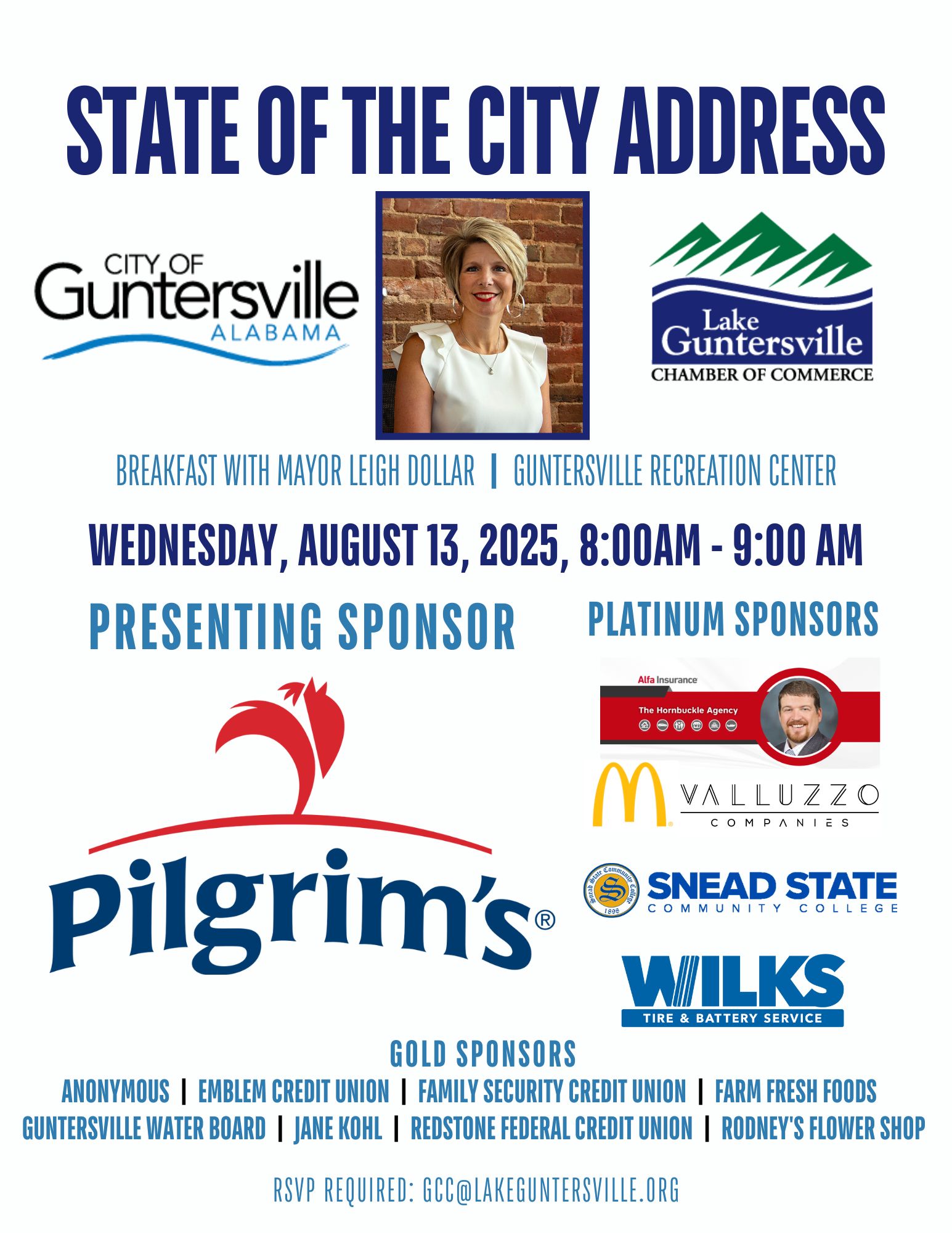 The Chamber of Commerce is delighted to provide the Mayor of Guntersville a forum to present The State of the City Address. The Mayor uses this opportunity to highlight the city’s progress in economic development and present an “annual report” regarding the challenges from the past year and an outlook for the year ahead.