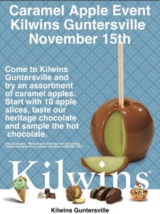 DETAILS: Caramel Apple Flights – Come to Kilwins Guntersville for a hands-on experience and try an assortment of caramel apples. Start with ten apple slices, sample Kilwins heritage chocolate, and top it off with a hot chocolate tasting.