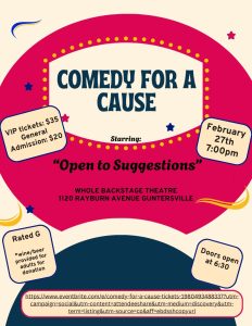 DETAILS: The Eventbrite link is LIVE! Please get your tickets for Comedy for a Cause asap! VIP tickets are $35.00; it includes early admission, wine, beer, water, and snacks before the show.