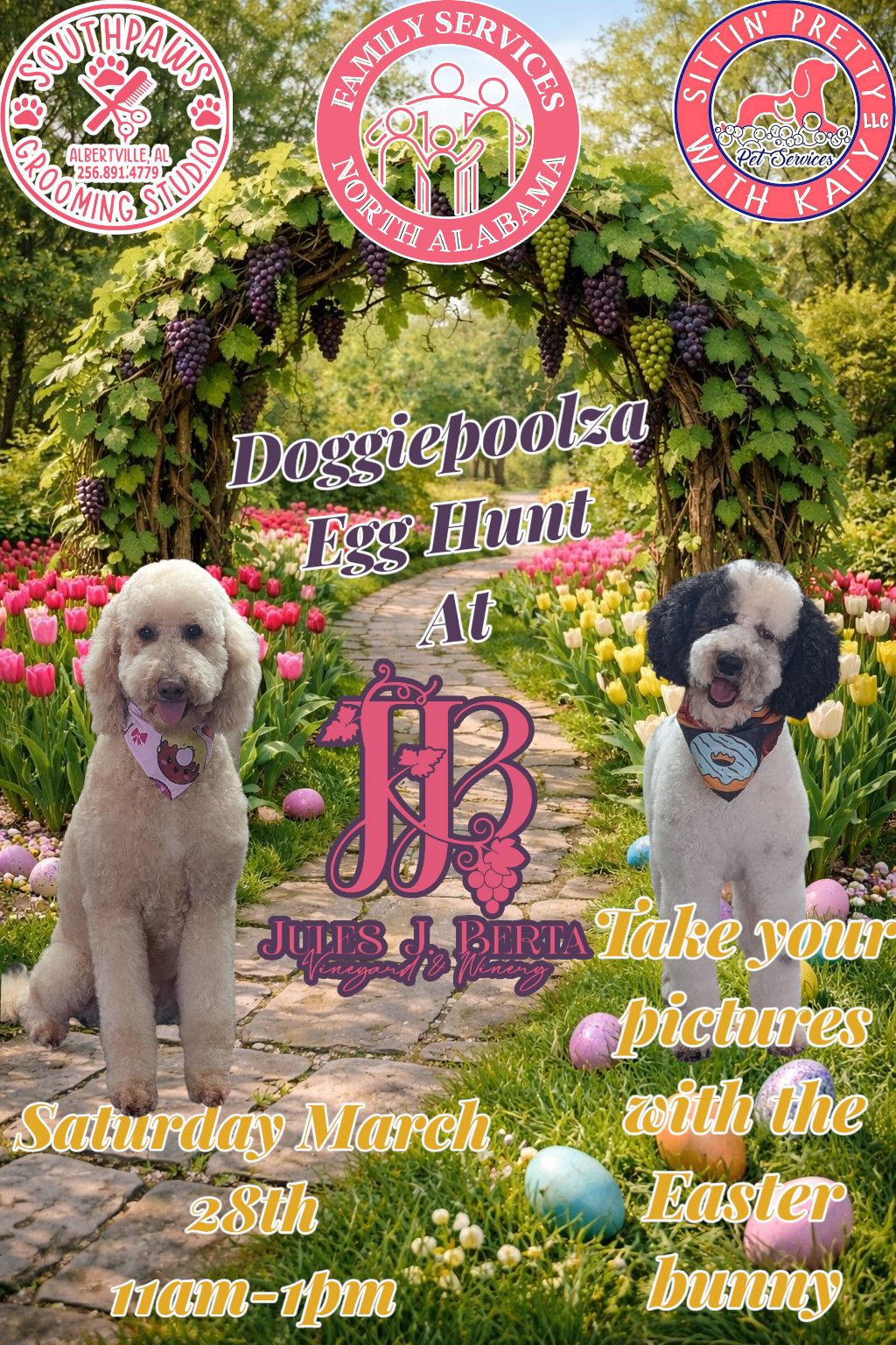 DETAILS: Doggiepalooza 2026 will be held at Jules Berta Vineyard!! Come out and support! We will have a Doggie Easter Egg Hunt AND the Easter Bunny will be there to take pictures with everyone!