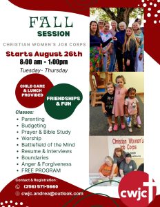 DETAILS: Call (256) 571-5660 or email cwjc.andrea@outlook.com to register!