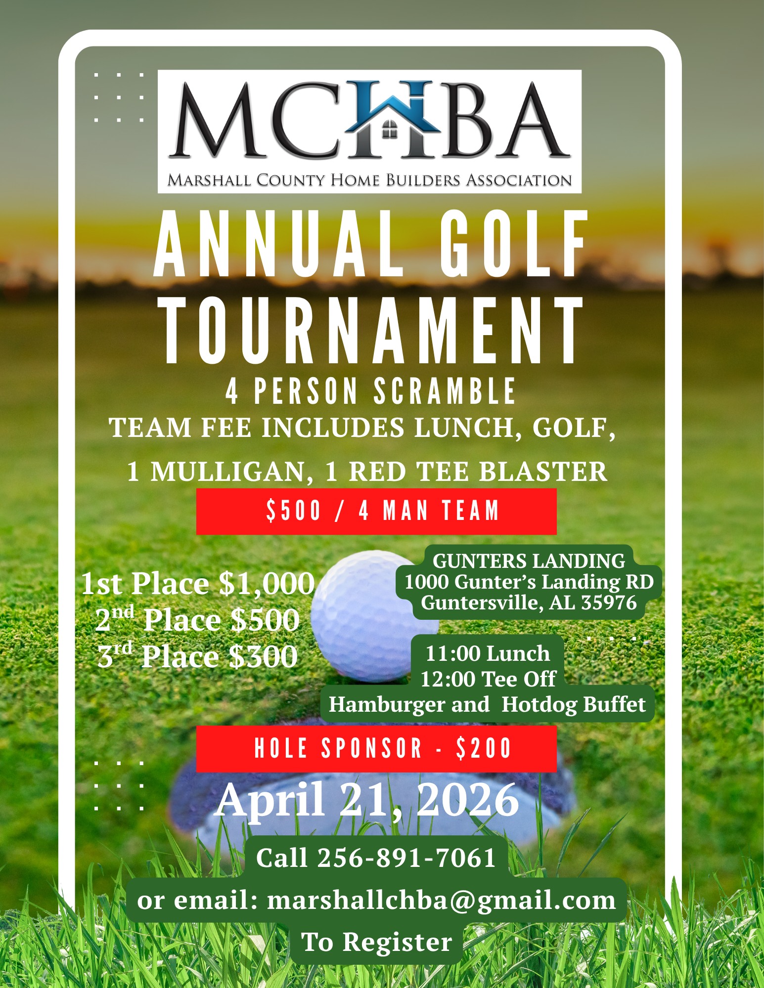 DETAILS: 4 person scramble. $500 per 4-man team. Call 256-891-7061 or email marshallchba@gmail.com to register