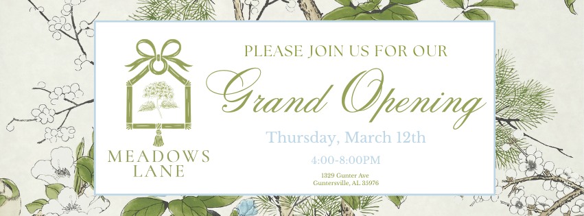 DETAILS: Join us for our Grand Opening! We are so excited to be opening our doors to the community and cannot wait for everyone to see what all we have been working on! Please join us for a fun-filled night with shopping, light refreshments and good company! March 12th from 4-8PM @ 1329 Gunter Ave Guntersville, AL 35976