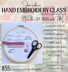DETAILS: Learn the art of hand embroidery in this beginner friendly class. You will learn 7 common stitches. No experience necessary.