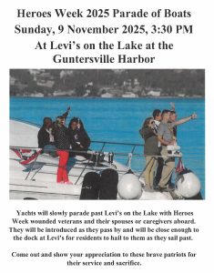 DETAILS: Yachts will slowly parade past Levi’s on the Lake with Heroes Week wounded veterans and their spouses or caregivers aboard. They will be introduced as they pass by and will be close enough to the dock at Levi’s for residents to hail to them as they sail past.