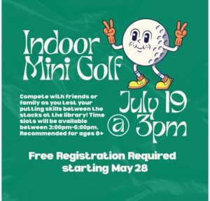 DETAILS: Want to enjoy a casual game of mini golf in the library after hours? We still have a few slots left! If you have friends or family that would enjoy, we encourage you to register your group for a time slot today! Register here: https://forms.gle/G1D7NDHZutvoBrgV