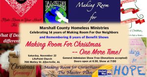 DETAILS: Marshall County Homeless Ministries, celebrating 14 years of making room for our neighbors and remembering 8 years of benefit shows. General Admission is free, but donations will be accepted.