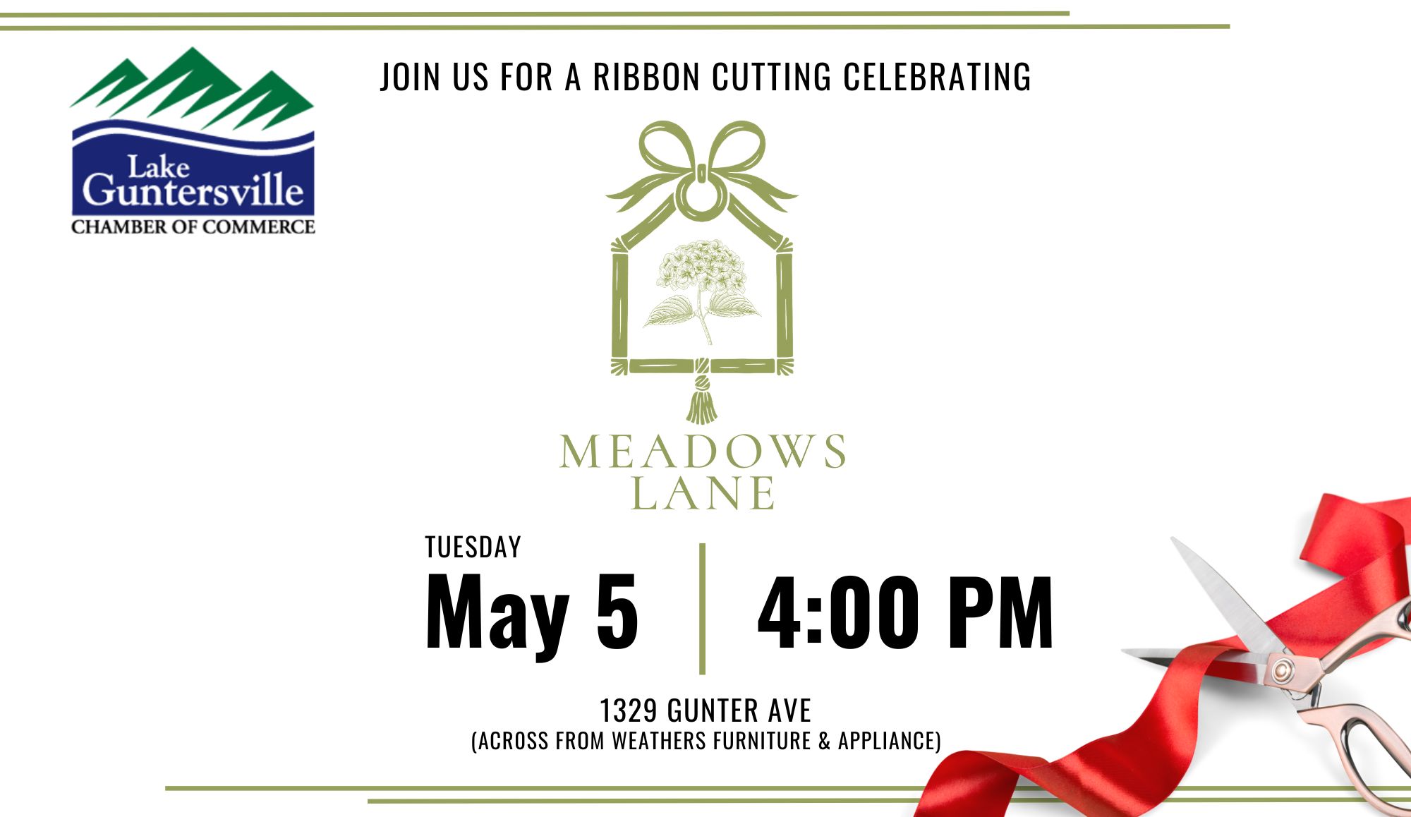DETAILS: Join us as we celebrate Meadows Lane with a ribbon cutting! The more, the merrier, so wrap up work early and join the fun.