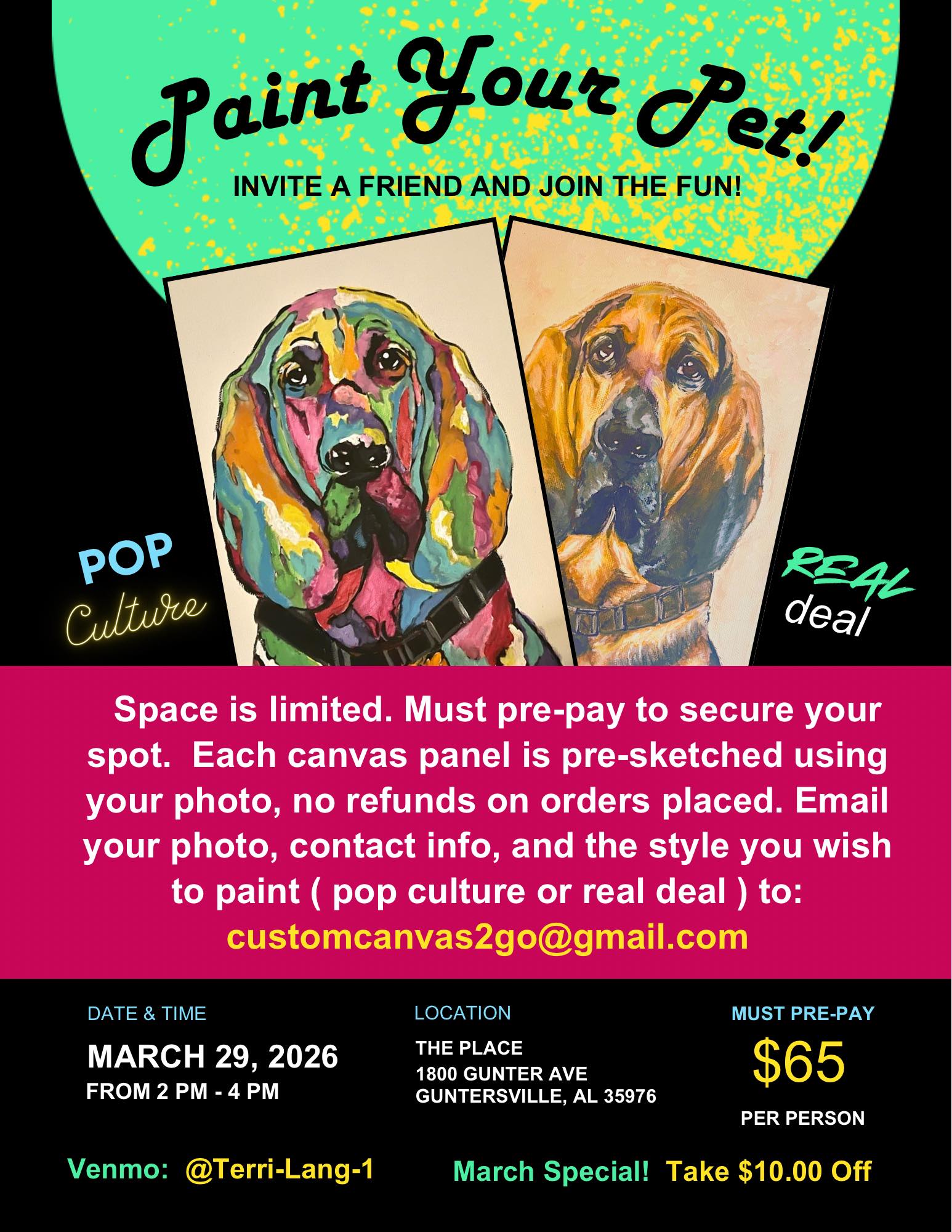 DETAILS: Must pre-pay to secure your seat. No refunds on orders placed. $65 per person. customcanvas2go@gmail.com