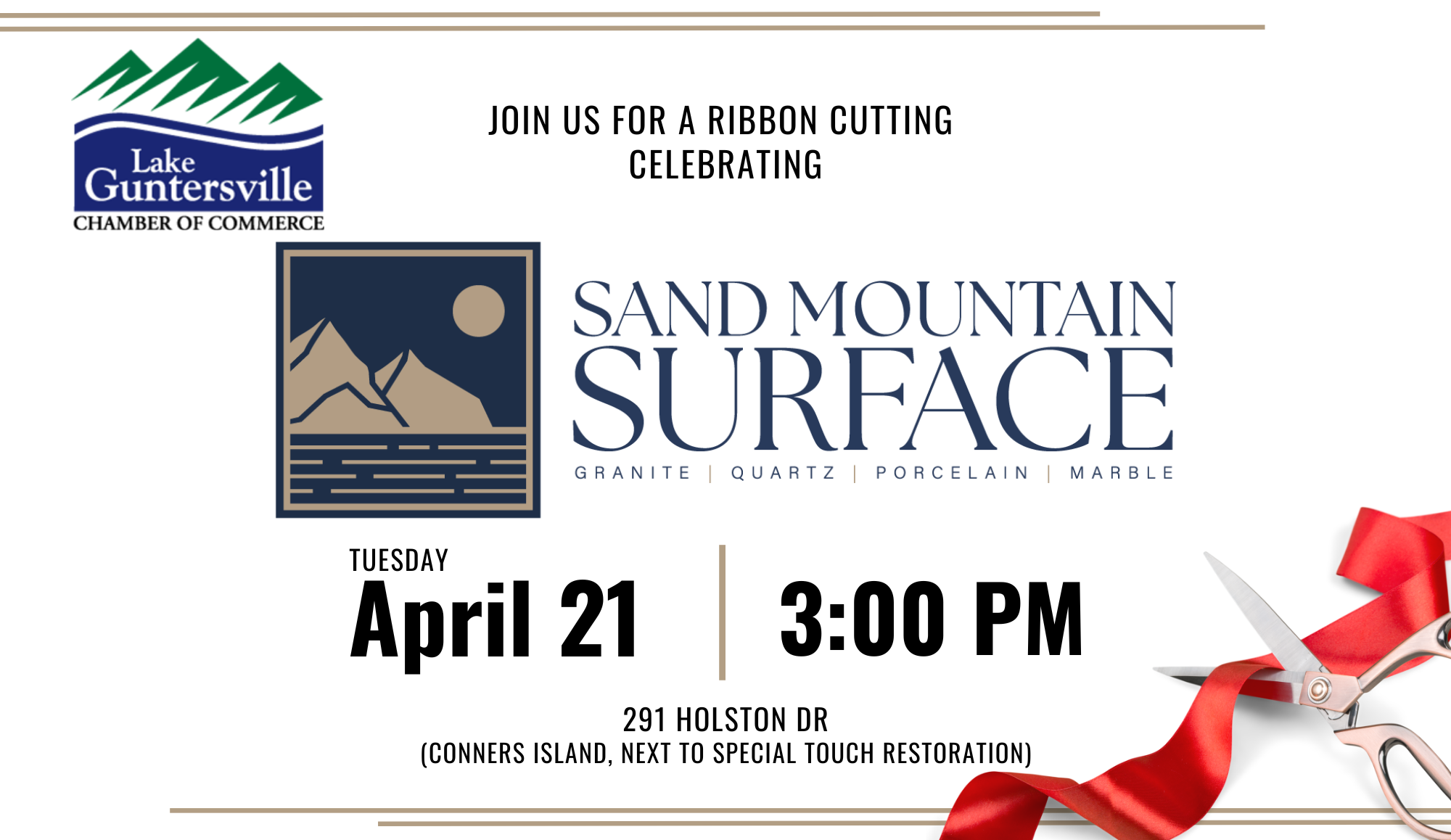DETAILS: The more, the merrier! Share the news and join us as we celebrate Sand Mountain Surface with a ribbon cutting ceremony. Check out their incredible new facility after we cut the big ribbon.