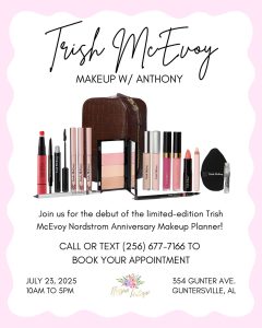 DETAILS: Join us for the debut of the limited-edition Trish McEvoy Nordstrom Anniversary Makeup Planner! Call or text (256) 677-7166 to book your appointment.