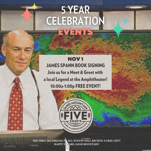 DETAILS: Join us as we finish off our 5 year celebration by welcoming James Spann for a FREE meet & greet + book signing! We will have local vendors showcasing what they can offer if you experience storm damage. From fencing, to insurance, cleanup and more! We will have fun crafts for the kiddos, and FIRST 50 FAMILIES WILL RECEIVE A FREE GIFT! Let’s offer James and his team a good old Sand Mountain welcome.